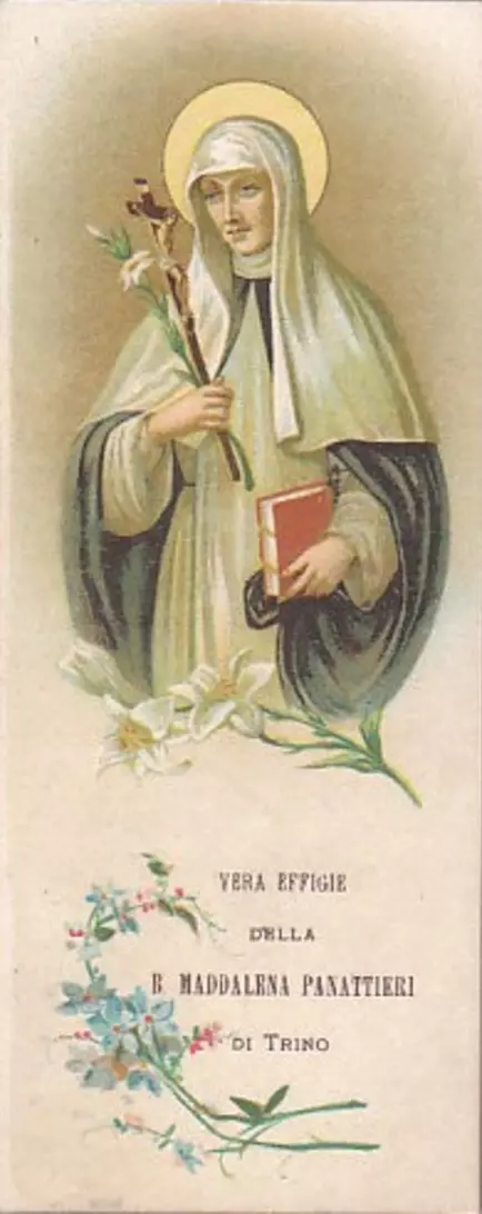 Madeleine, née à Trino, au diocèse de Verceil, de l’honorable famille de Panatieri, vers le milieu du XVesiècle, apparut douée de la beauté du corps et des charmes de l’esprit. Prévenue par les dons célestes, elle se détourna de tout ce qui risquait de souiller la sainteté et l’innocence de sa vie : en effet, elle se garda du luxe, de la société des mondains, des excès de la langue et de la liberté des regards. Aussi, rien d’étonnant à ce que, toute petite encore, elle ait voué à Dieu sa virginité. Admise bientôt parmi les sœurs de la Pénitence de Saint Dominique, sur sa demande instante, suivant l’exemple austère de la séraphique Catherine de Sienne, elle s’appliqua par ses jeûnes, ses veil1es, ses continuelles prières, ses flagellations, sa patience, son humilité et sa mansuétude, à se rendre digne des épousailles divines. Très modérée dans la nourriture et le sommeil, elle était si absorbée par la prière et la méditation des choses célestes, que parfois elle veillait des nuits entières dans cette contemplation. D’une piété fervente et affectueuse pour la Passion du Christ, elle mérita de participer aux douleurs de son Époux. Elle avait un très grand culte pour le très saint Nom de Jésus, et s’approchait tous les jours de la sainte table.