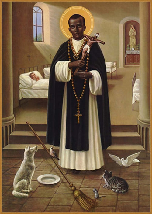 Martin naquit à Lima dans l’Amérique du Sud, l’an de grâce 1569, de Jean de Porrès, qui était de sang noble, et d’Anna Vélasquez. Dès son plus jeune âge il donna, par la merveilleuse pureté de sa conduite, des signes de sa future sainteté. En effet, ses vertus de modestie, d’humilité et sa générosité envers les pauvres rendaient l’enfant admirable aux yeux de tous. Cependant il grandissait et, avec lui, grandissait continuellement sa compassion pour le prochain, pour les malades surtout. C’est pourquoi il s’appliqua de son mieux à l’étude de la chirurgie, afin de pouvoir, sans aucune rétribution, procurer la guérison ; et ce désir devait très souvent se réaliser. Afin que l’amour de Dieu se répandît toujours plus dans son cœur, il rejeta les honneurs et les plaisirs mondains, quitta la maison paternelle, et demanda instamment à entrer dans le Tiers-Ordre du saint Patriarche Dominique et à être compté parmi les familiers laïques. Son désir fut exaucé. Lorsqu’il eut, à la grande admiration de tous, achevé son noviciat et prononcé ses vœux solennels, qui pourrait dire avec quel zèle, quelle application il s’efforça de pratiquer et de rechercher les vertus de tous genres qui font le parfait religieux ? Il aimait tellement l’humilité, qu’il fit toujours ses délices d’accomplir les besognes les plus basses et les plus viles du couvent, de se désigner comme le plus grand pécheur et, s’agenouillant, de baiser les pieds de ceux qui ne craignaient pas de le charger de malédictions.