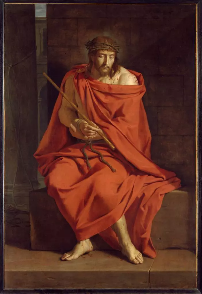 Ce n’est pas une fête de la Passion, qui solennise l’humiliation du Sauveur, assis sur un escabeau, vêtu d’un lambeau de pourpre, coiffé d’une touffe d’épines, un roseau à la main, en guise de sceptre, et que des soldats romains frappent durement. Scène sauvage que le Fils de Dieu voulut subir pour l’expiation de notre orgueil.
