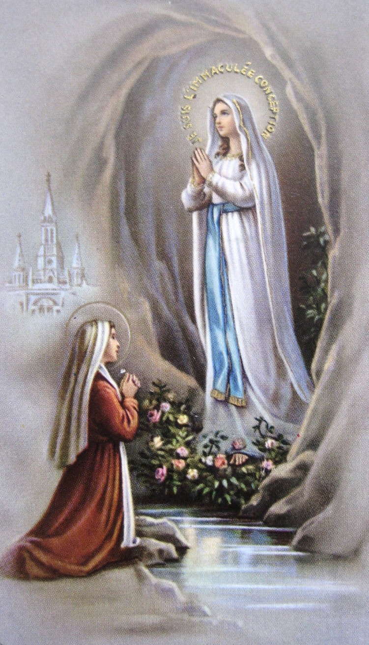 Mais Bernadette, la jeune voyante, voulut savoir son nom. Et la Vierge toute belle, les mains jointes sur sa poitrine, les yeux levés au ciel dont la béatitude la remplissait, dit : « Je suis l’immaculée Conception. »C’était la réponse de Marie à Pie IX, la signature posée par elle-même à la bulle pontificale.