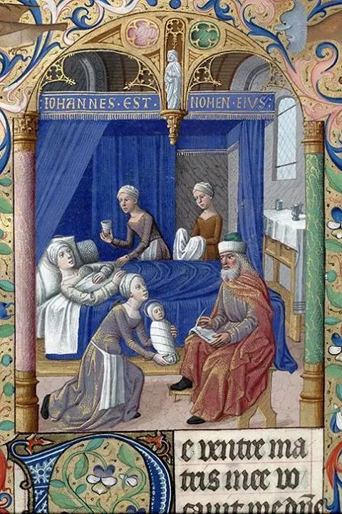 Évangile selon Saint Luc., c. 1. : « Le temps de l’enfantement d’Elisabeth arriva et elle mit au monde un fils. Ses voisins, ses parents apprirent que le Seigneur avait manifesté en elle sa miséricorde et ils l’en félicitèrent. Le huitième jour ils vinrent pour circoncire l’enfant et ils voulaient l’appeler du nom de son père, Zacharie. Et sa mère leur répondant, dit : Pas du tout, il s’appellera Jean. Ils lui dirent : Mais personne dans votre parenté ne porte ce nom. Et ils faisaient signe à son père pour qu’il montrât comment il voulait l’appeler. Il prit un stylet et écrivit : Jean est son nom. Et tous étaient dans l’étonnement. Mais aussitôt sa bouche s’ouvrit, sa langue fonctionna et il parla en bénissant Dieu. Tous les voisins furent remplis de crainte et le bruit de ces événements se répandit sur toutes les montagnes de la Judée. Chacun se demandait en soi-même et disait : Que pensez-vous que sera cet enfant ? Car la main du Seigneur était avec lui. Et Zacharie, son père, fut rempli du Saint-Esprit et il prophétisa en disant : Béni soit le Seigneur, Dieu d’Israël, car il a visité et sauvé son peuple. »
