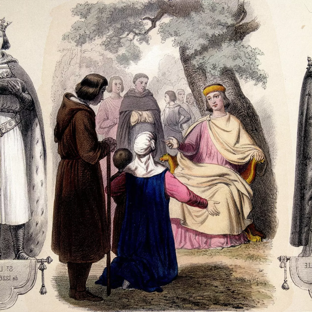 Juste, aimable, gracieux, comme il convenait au premier chevalier de France. Bon à tous, simple d’allure, pur de mœurs, brave devant le péril, et surtout aimant Dieu de toute son âme, tel se présente le roi Louis. Il avait un amour de préférence pour les Prêcheurs et les Mineurs, qui à l’époque exerçaient autour d’eux la plus féconde influence. Blanche de Castille, sa mère, le confia à leurs soins. Devenu roi, il aimait à venir s’asseoir sur la paille, comme les autres écoliers, au pied d’une chaire où était assis Frère Thomas d’Aquin, au couvent de Saint- Jacques de Paris. Il écoutait avidement ses doctes leçons et, désireux de l’entendre plus intimement, il l’invitait à sa table. Mais Thomas, le silencieux contemplatif, y était bien distrait. Chacun sait qu’un jour, à cette table royale, oublieux du roi, oublieux du repas, absorbé par une pensée, il donna soudain un violent coup de poing sur la table, en s’écriant : c’en est fini des manichéens ! Le saint Docteur avait trouvé un argument décisif contre eux. Le bon roi saint Louis sourit aimablement et fit immédiatement écrire l’argument de Frère Thomas.