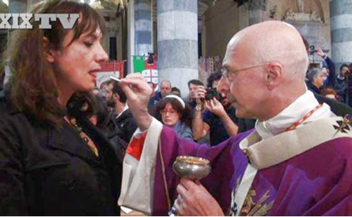 Il faut préciser qu’à l’occasion de cette célébration le cardinal fit le panégyrique du curé révolutionnaire dans son homélie et permit à deux transsexuels de faire l’apologie de l’idéologie LGBT [2] au cours de la « prière universelle », durant laquelle ils ont tenu à remercier le prêtre apostat de les avoir aidés à « se sentir des créatures trans-gender [sic] aimées et voulues par Dieu ». Le prélat italien leur a ensuite distribué personnellement la communion, profanant ainsi les saintes espèces eucharistiques. Scandale de proportions gigantesques et qui, cela va sans dire, n’a provoqué aucune réaction de la part du Vatican.